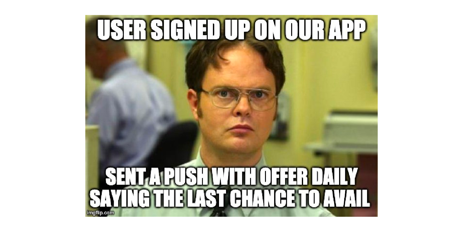 Everything from the special flash sales to the end of month sales to big million-billion days is becoming the norm of the day. And users do not like participating in them if the deals just keep coming and hitting them too often. By doing this you are just inviting hatred and uninstalls from the user. Once a value proposition is put forth and heard by the user, creating pressure and urgency might not be the best way forward.