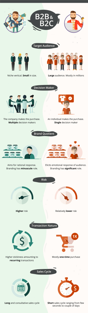 - The target audience in B2B is niche. They need to restrict their marketing to a very smaller base of prospects whose number only in rare cases would touch 5 digits. B2C, on the other hand, caters to a relatively large audience.