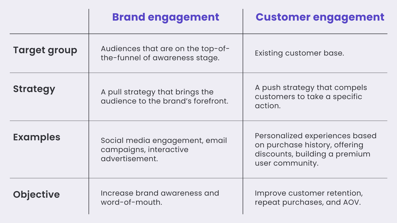 Brand engagement is usually top-of-the-funnel (TOFU) and can target audiences who are unaware of your brand and have no purchase history. In contrast, customer engagement targets your current customer base.