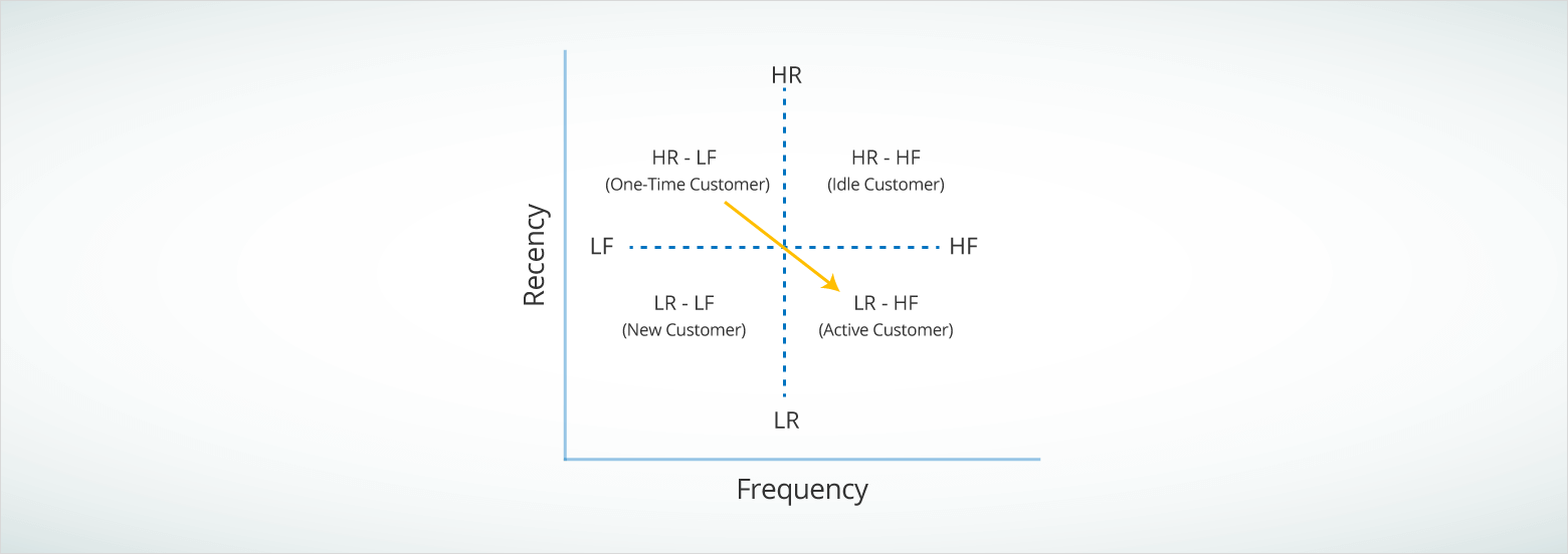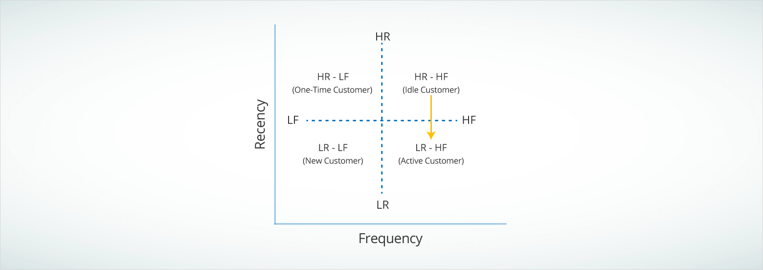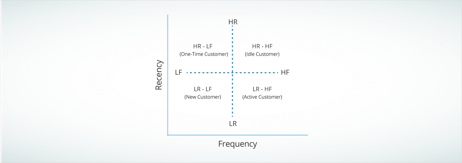 For the simplicity of this post, let’s keep the RFM segmentation model two-dimensional and use Recency and Frequency only.