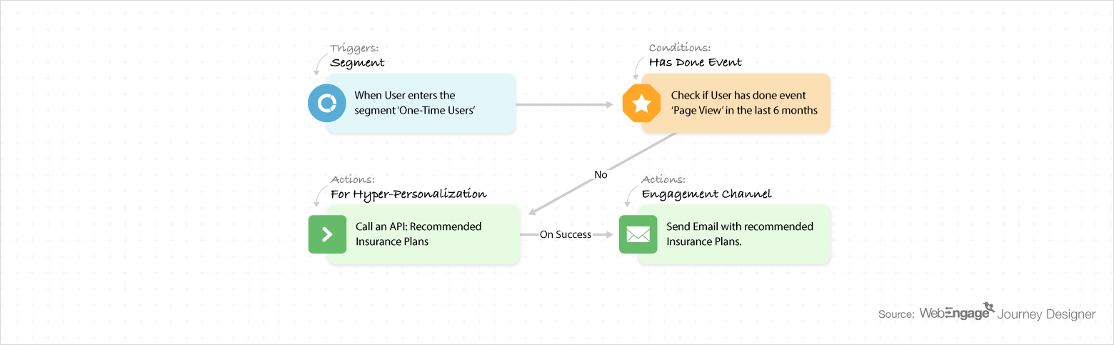 For instance: suppose XYZ Insurance wants to cross-sell related insurance plans recommendations to all its inactive users who purchased an insurance plan 2 years back. This workflow will help them do the needful: