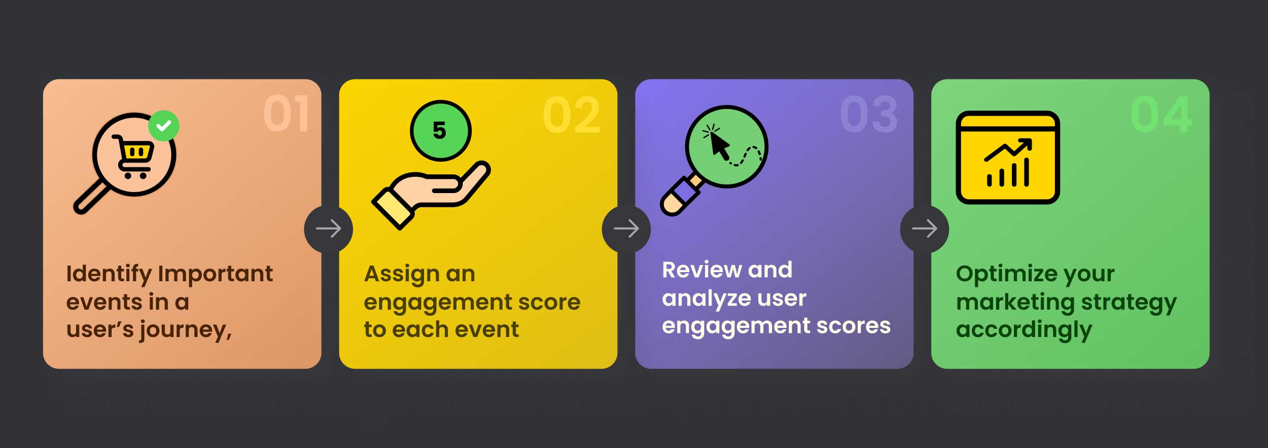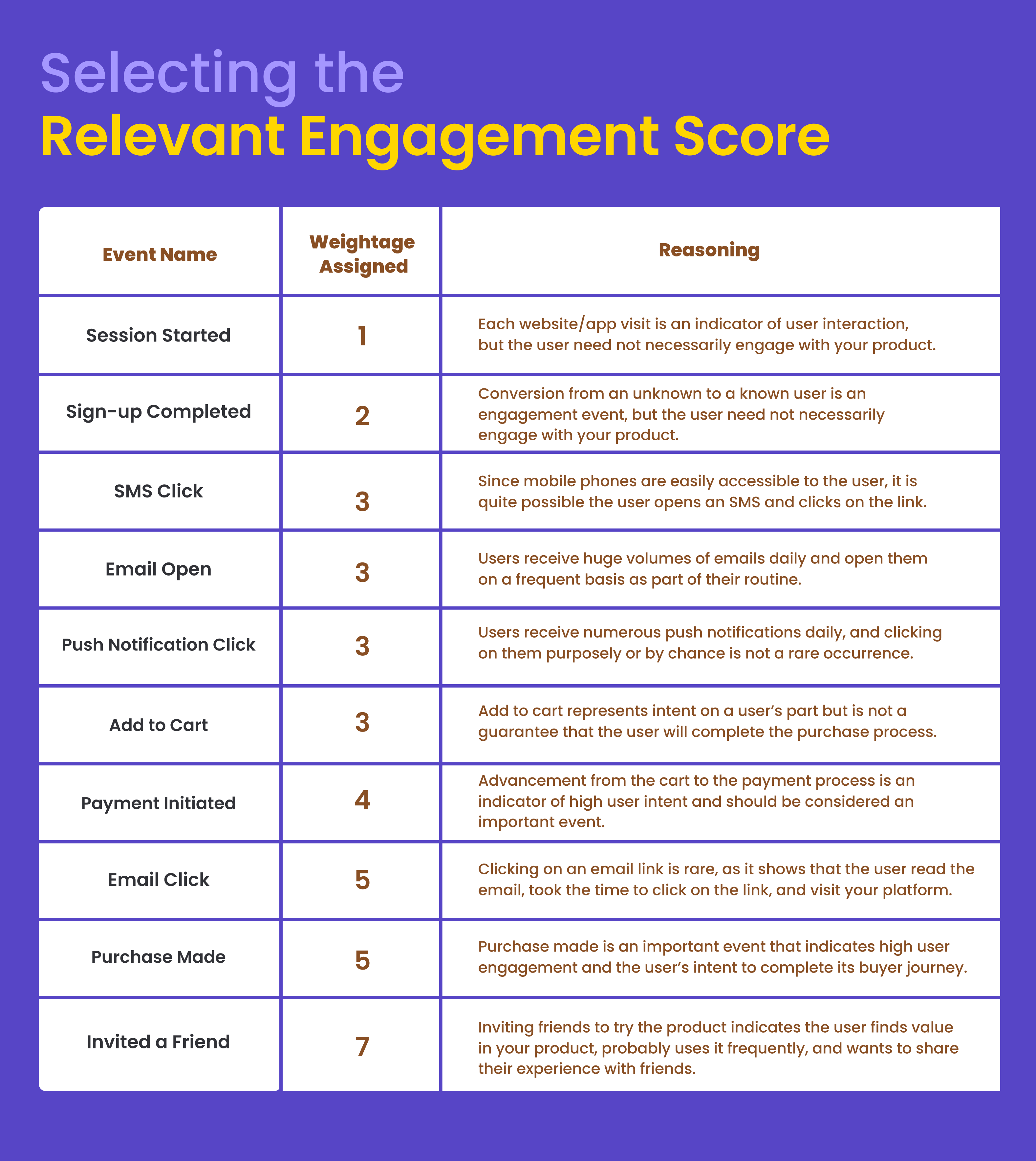 Now, assign weightage to each event based on its importance to your engagement strategy and user journey. Therefore, events of the least significance should be given the lowest score, such as between 1-5 on a scale of 1-10. Events of higher significance should be assigned a higher score, such as above 5 on a scale of 1-10.