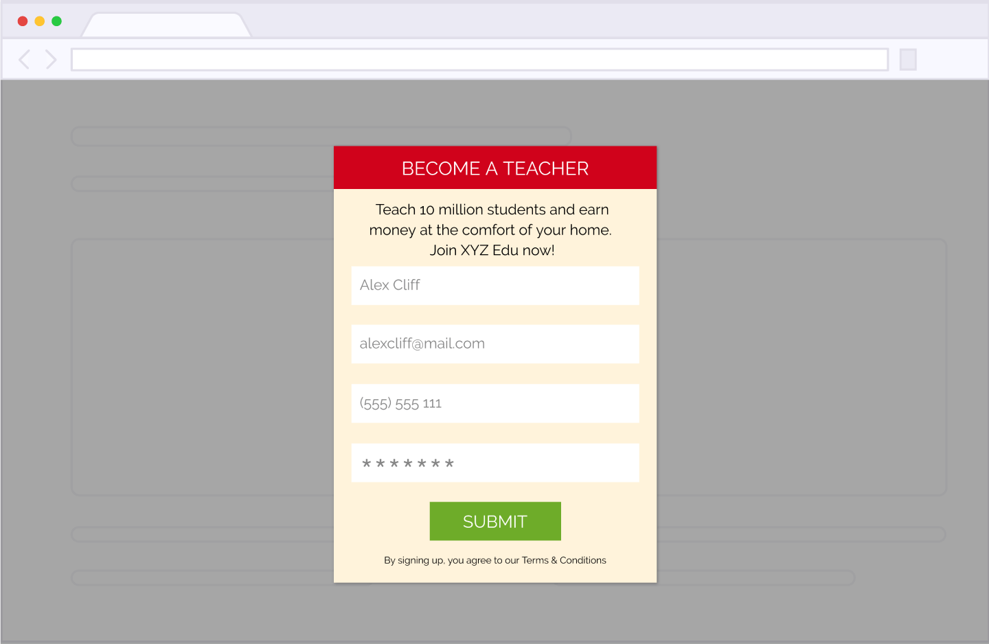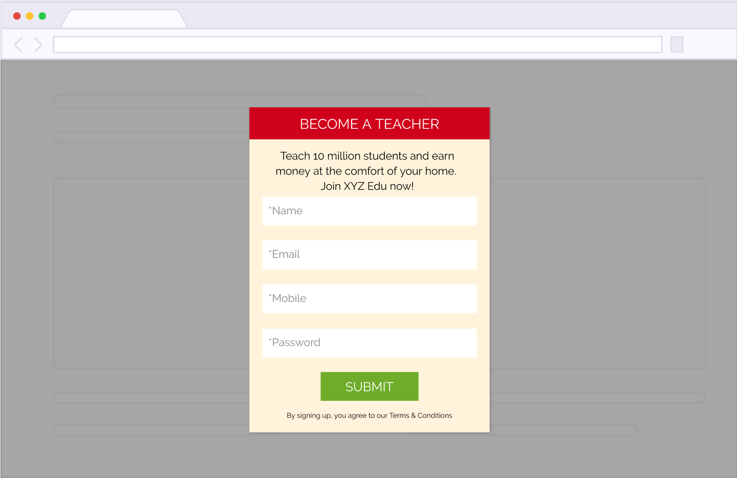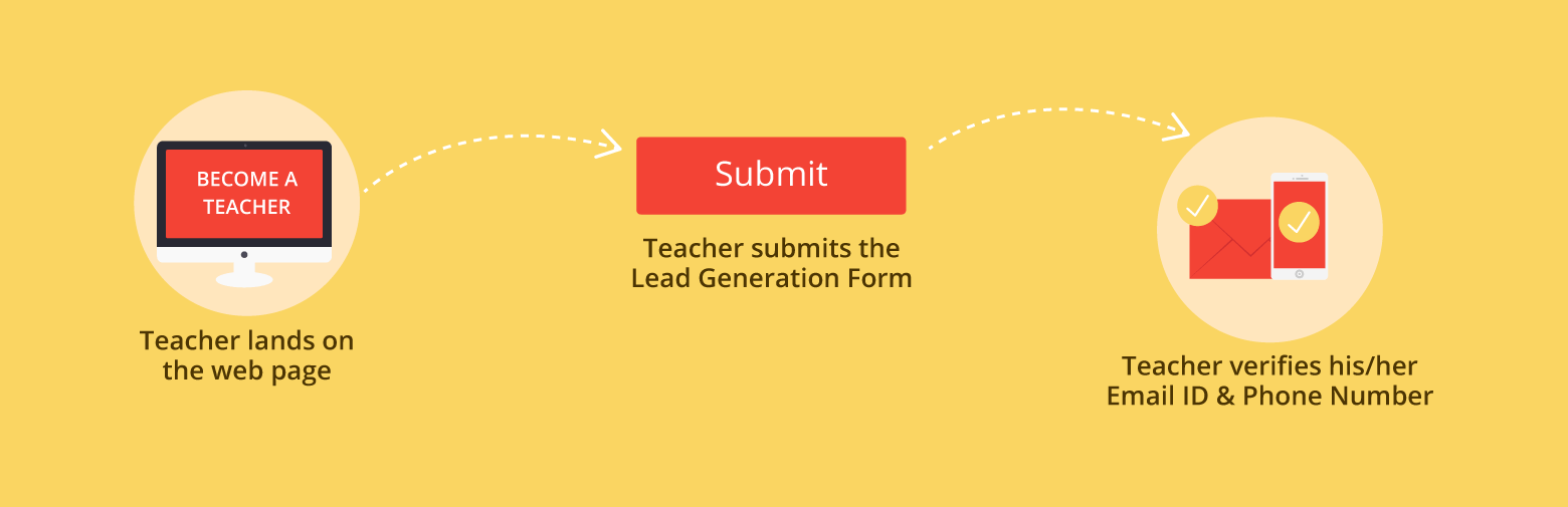 A Teacher lands on the lead generation landing page through multiple acquisition sources like social media, cold email marketing, display ads, search engine, etc. If interested, he/she signs up by submitting a lead generation form (like the one given below). And this turns the Teacher into a lead (or contact).