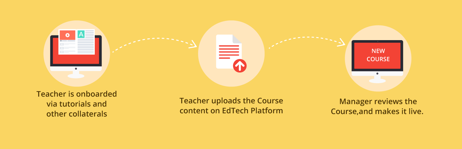 Next step is to onboard the Teacher, and educate him/her about the edtech platform. This is done by providing regular training and how-to’s manuals. The Teacher is also assisted in uploading the course content. Once uploaded, the Edtech Manager reviews the course before making it live.