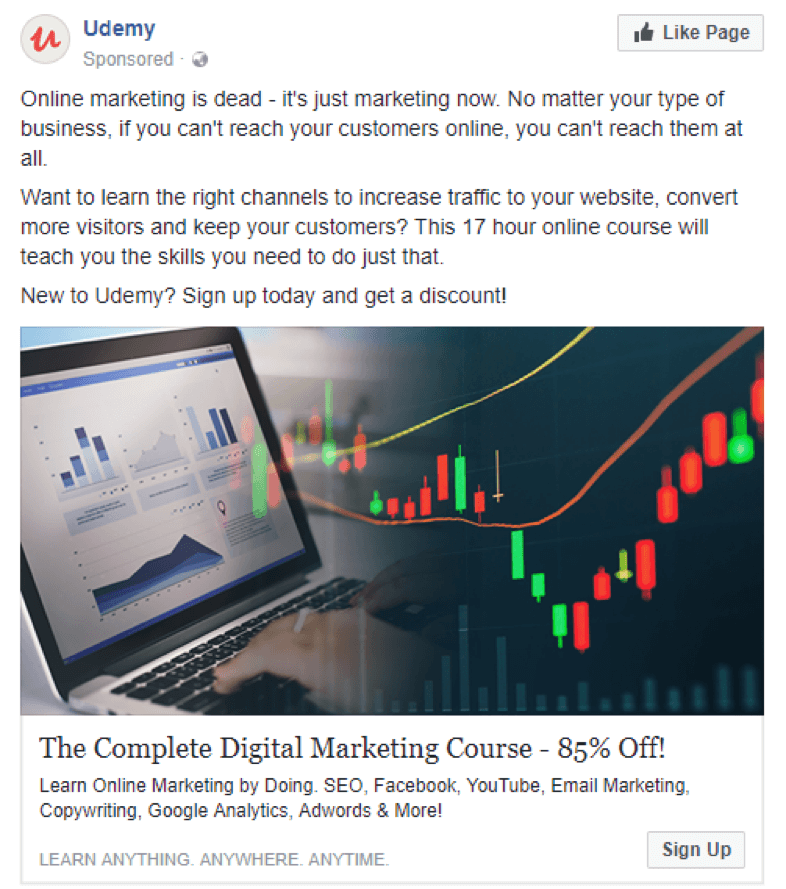 Even Udemy retargets visitors who were only a few steps away from converting with relevant Facebook ads. Here’s the remarketing ad I received after I checked out a digital marketing course on their website. They’ve even sweetened the deal with an attractive discount.