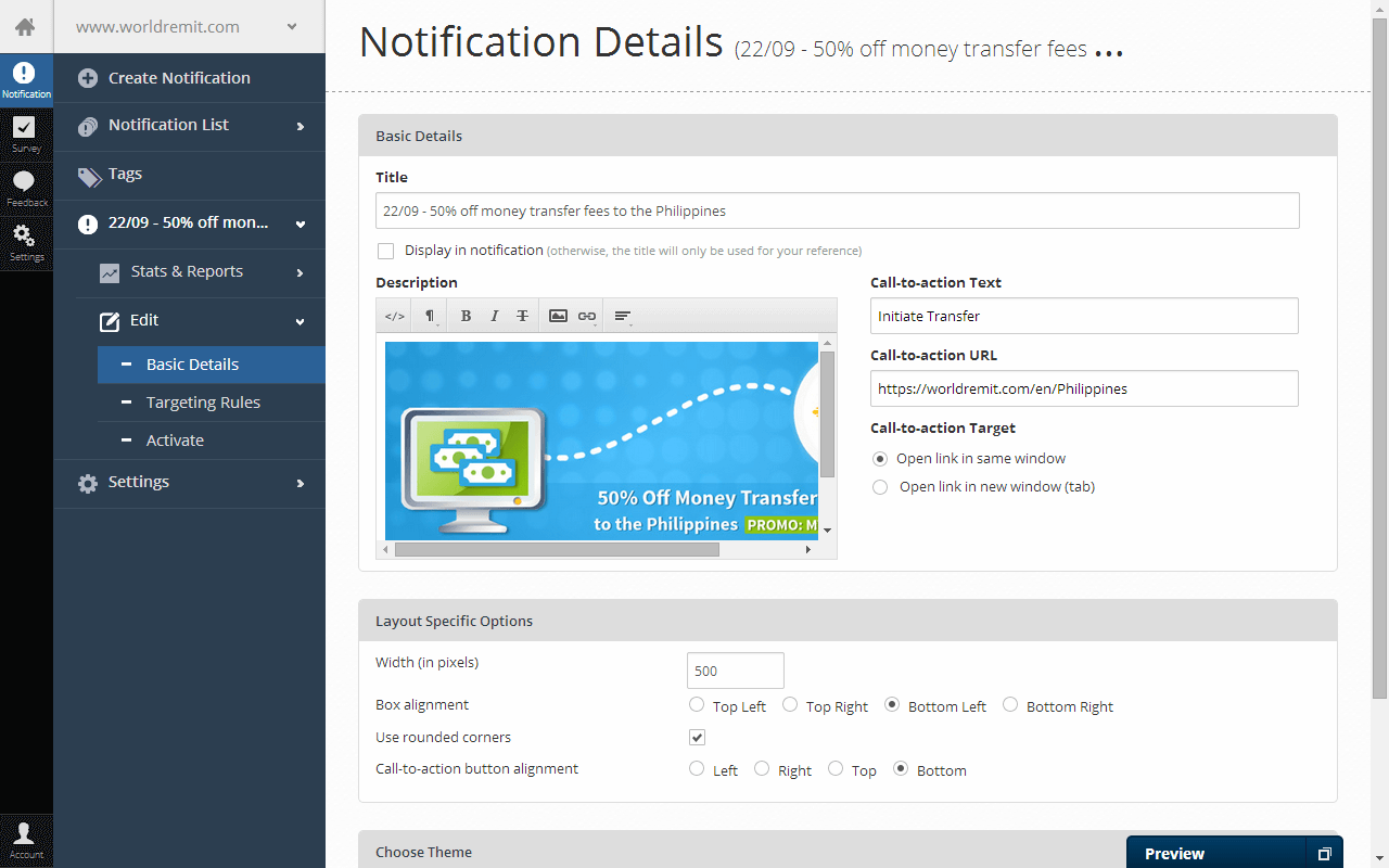 The WorldRemit team created their on-site promotions using WebEngage Notifications – adding copy, uploading images, styling the notifications and most importantly, using targeting rules to pop these to the right segment of users coming to their site via corresponding email marketing campaigns.
