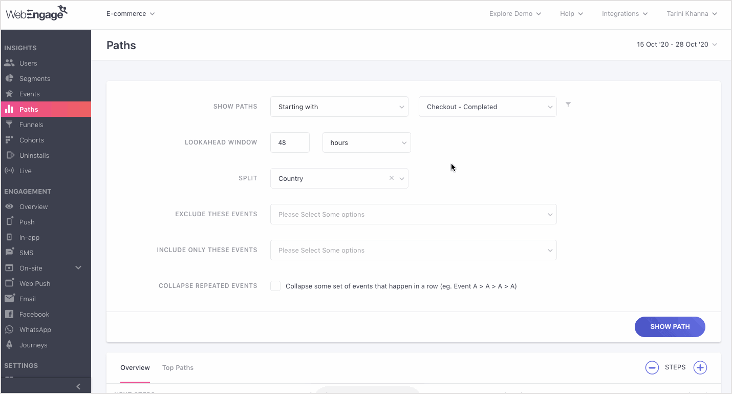 On the WebEngage dashboard, you can split a Path by different event attributes and compare how different users interact with your app. For example, you can split your anchor event by Country and compare Paths by users acquired from different geographies. You can discover what makes each group stick and customize the experience for different users and versions of your product.