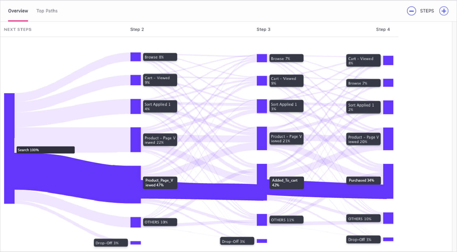 This is an ideal funnel. But in reality, it’s oversimplified. With Paths, the E-commerce business can conduct a Path Analysis to see what actions are taken by users after searching the product.