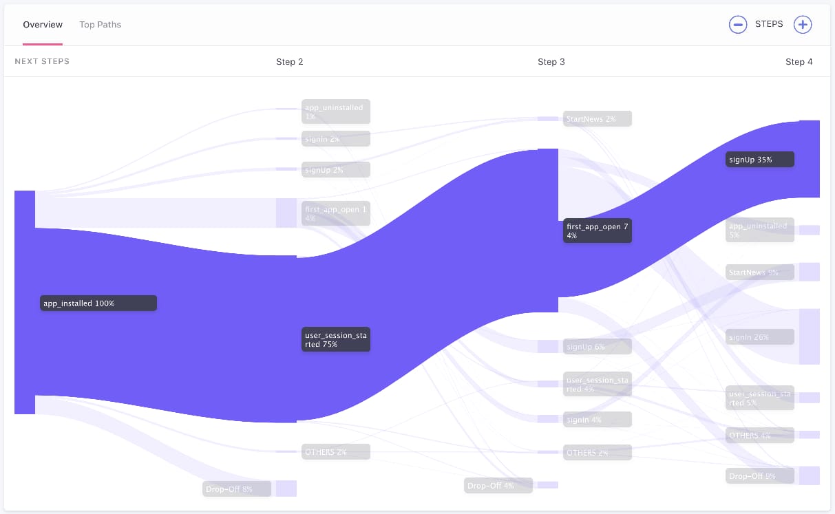 While you can measure these conversion steps with Funnels and build hypotheses around the possible reasons for drop-offs at each step. With Paths, you now know exactly where the remaining users go after installing the app. You can then create user journey to get them back to the main flow.