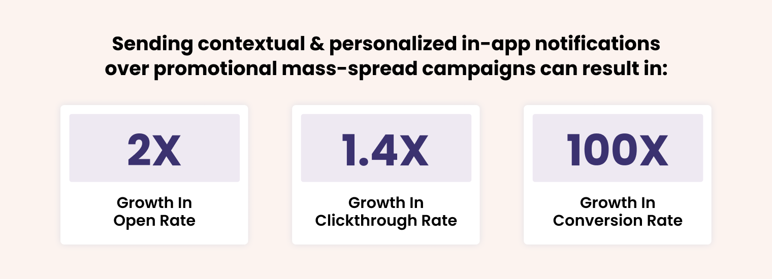 In-app notifications help target users with contextual messages within the app that increase engagement and drive revenue. In fact, sending such relevant & personalized in-app notifications can result in a 2 times higher open rate, 1.4 times higher click-through rate, and 100 times higher conversion rate! For more information, refer to our Ebook on Omni-Channel User Engagement. Thus, backed by real-time user insights and powerful features, you can create memorable experiences for the user each time.