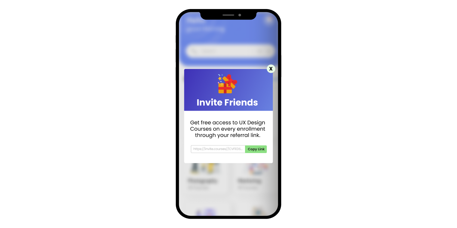 - Edtech: You can ask users to invite their friends to enroll in courses with the user’s referral link/code. As an incentive, the user receives X number of credits towards their courses for X number of enrollments made with their referral code.