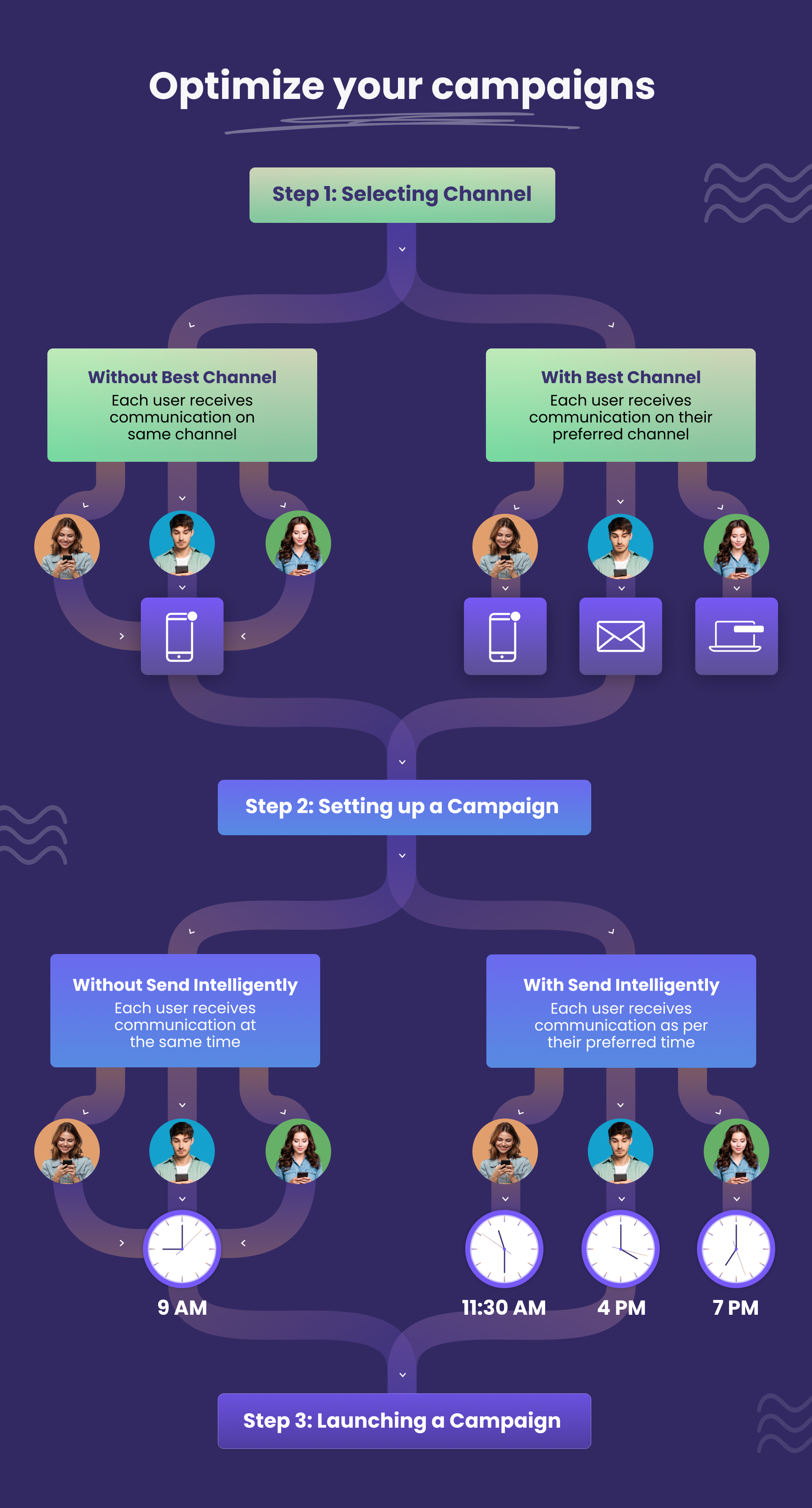 Intelligent campaign optimization takes the guesswork out of your marketing campaigns, helping you focus on your marketing strategy. Combined with segmentation and personalization, optimizing campaign send-time and channel can lift engagement, increasing conversions. We hope you try out these features and share your feedback. If you need more assistance, get in touch with your Customer Success Manager or reach out to product@webengage.com to get started.