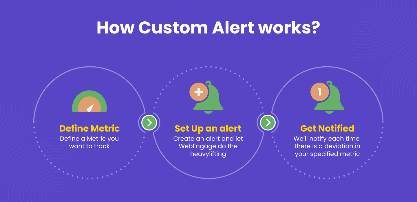 Custom alert is an essential feature because it enables marketers to receive notifications in cases of deviations for specified events. It acts as a watchdog and keeps an eye out to help you proactively monitor and take appropriate action ahead of time. In case you wish to try this feature, reach out to us at product@webengage.com.