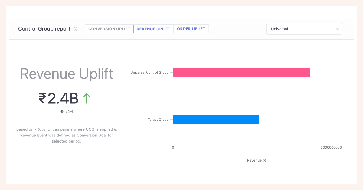The Universal Control Group: Revenue & Order Uplift feature isolates a subset of users, the control group, from receiving the campaign. By comparing the behavior of this control group with the target group that receives the campaign, marketers can accurately measure the upliftment of critical metrics such as conversions, revenue, and orders. This properly explains the campaign’s effectiveness, enabling data-driven decision-making.