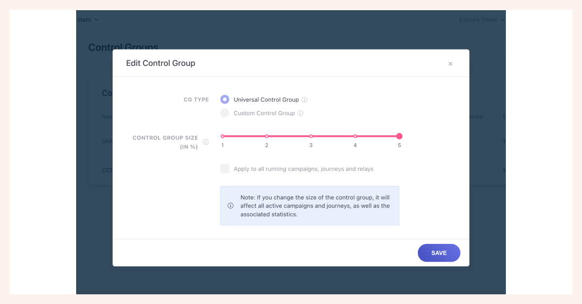Let’s walk through the dashboard process with an example — Imagine you’re running a promotional campaign for your e-commerce store, offering discounts on select products. Here’s how you can utilize the Universal Control Group feature: