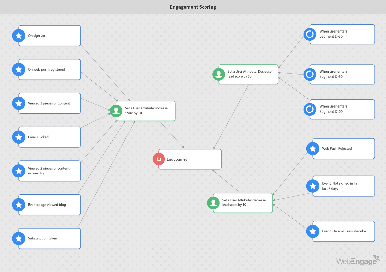 This journey shows a simplistic version of engagement scoring logic for content/media business. This journey distributes scores across 3 broad categories –