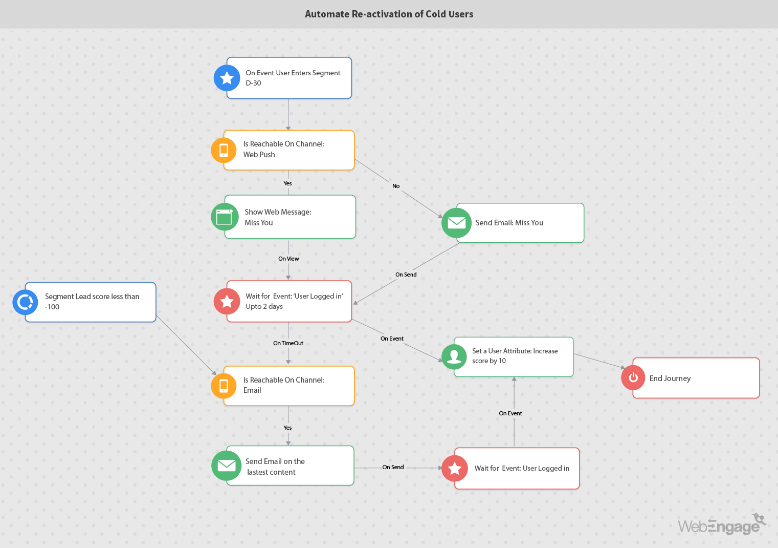 - The journey is triggered for each user as they enter segment D-30 (Inactive for 30 days) or when the user’s lead score is less than -100.