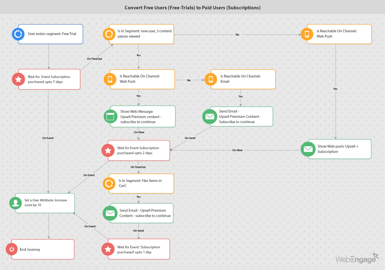 - Failing this, check if the user belongs to the engaged segment (based on their activity during the trial period). If the user has not engaged with your content, end the journey.