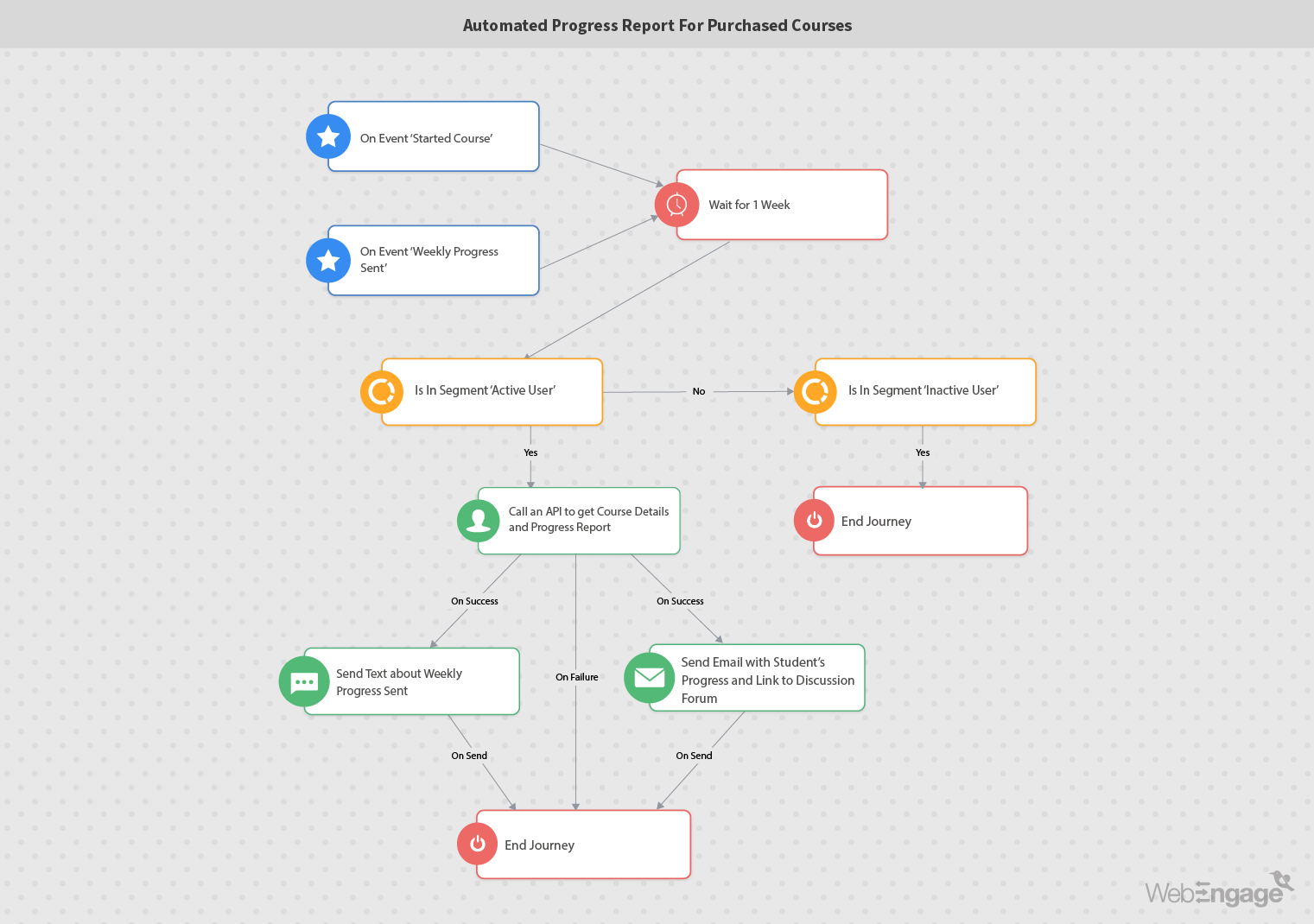 - The workflow is triggered for each user when they either start a new course or when their last weekly progress report is sent.