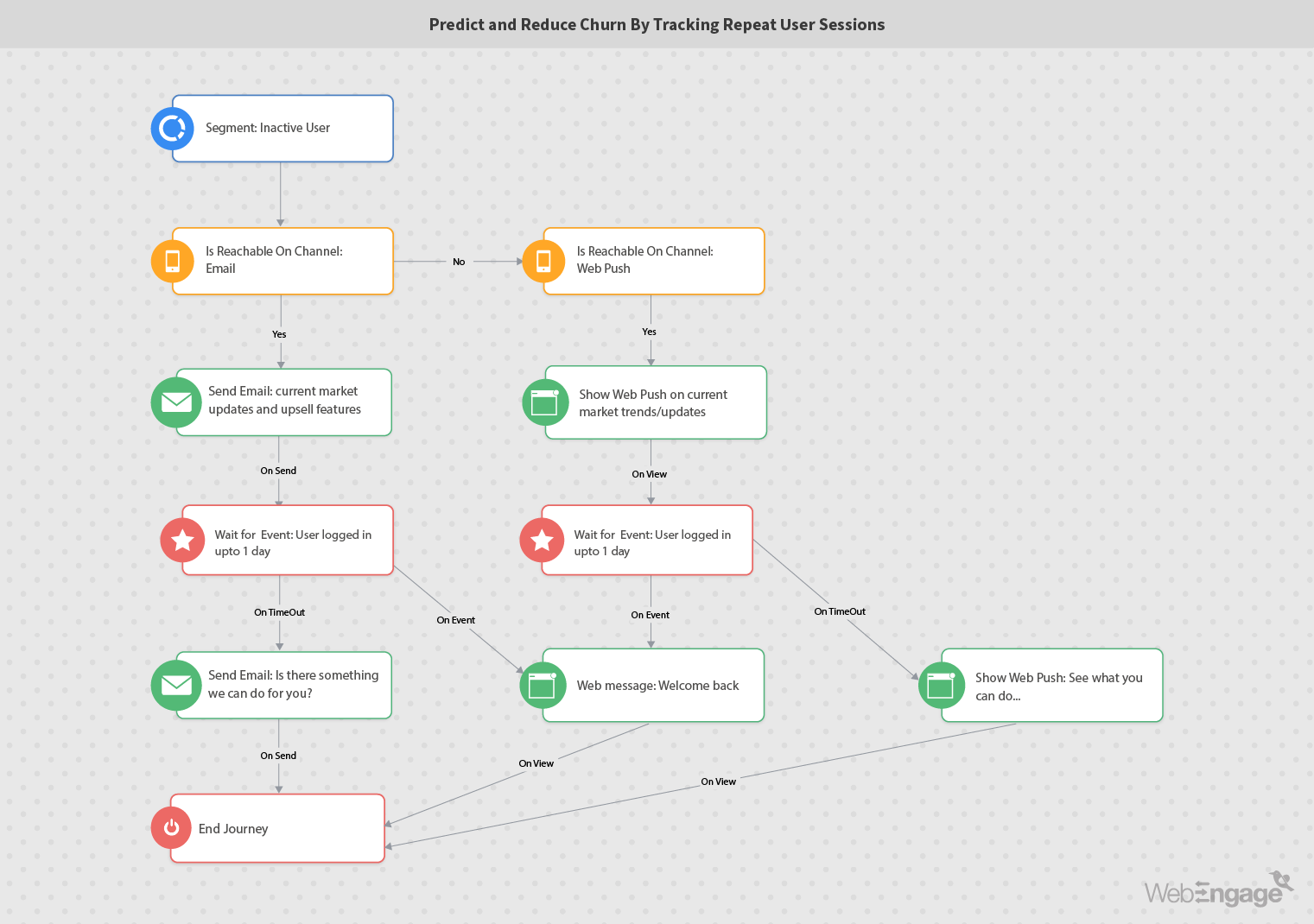The key to predicting churn is the ability to track and segment users who were active in the past but have reduced their browsing/transaction frequency recently. The second piece in reducing churn is selecting the right channel to engage on. Automatically selecting the right channel in real-time and triggering targeted messages at scale is a challenge that WebEngage specializes in.