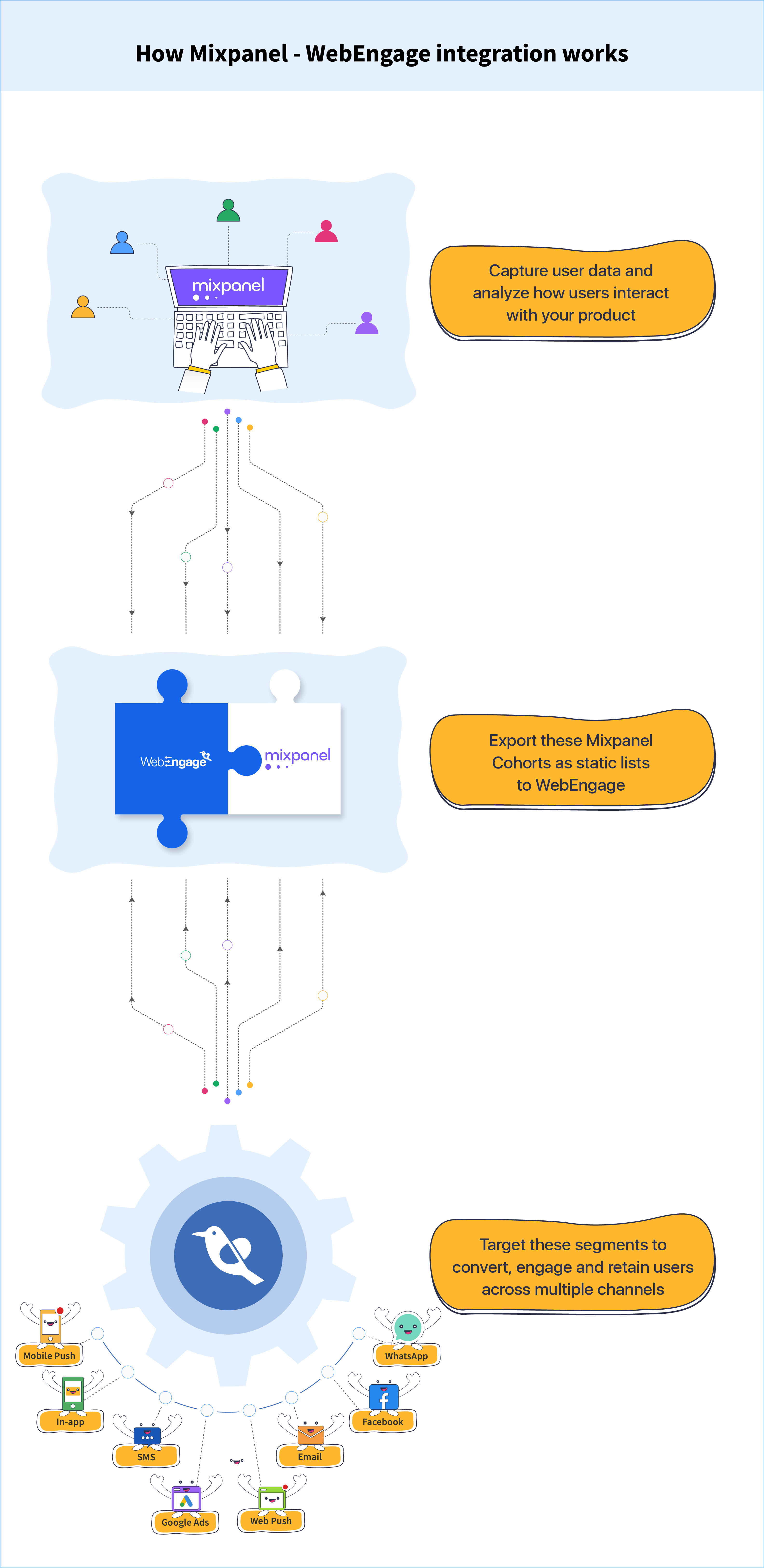 You need to understand how your users interact with your product. This is the foundation to create personalized marketing campaigns. Also, targeting your users with the right content at the right time helps convert, engage, and retain them. The Mixpanel integration with WebEngage helps you break this silo by allowing you to export cohorts from Mixpanel to WebEngage wherein you can engage your users and create more personalized campaigns across all your channels of user engagement.