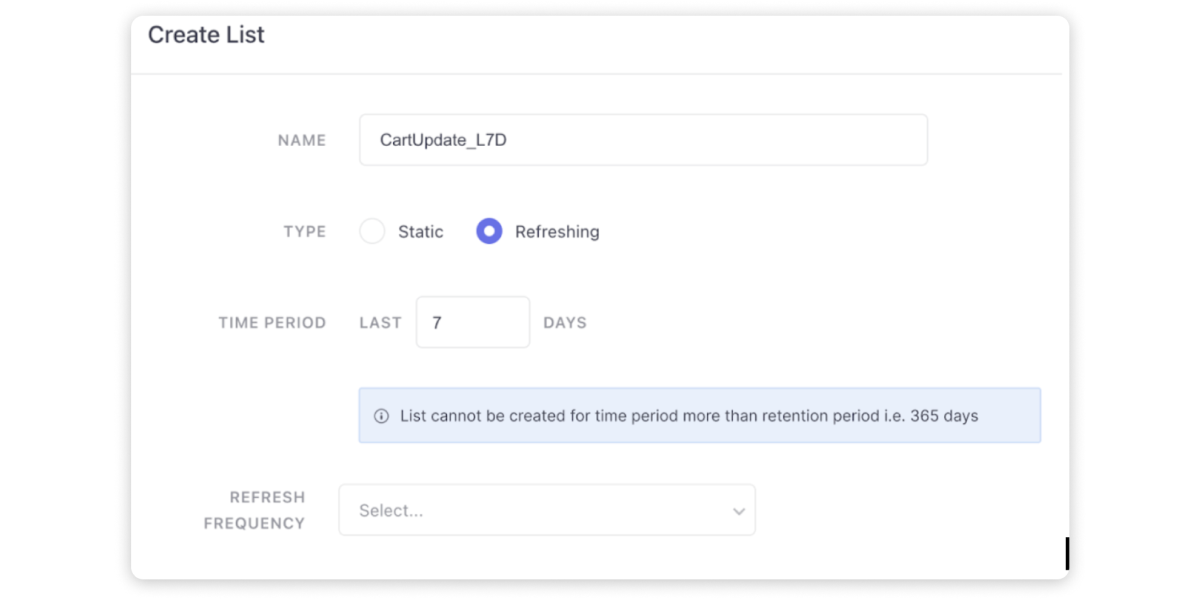 - Craft Static or Refreshing lists directly within Event Analytics based on specific Data Point(s) or Series, providing a dynamic approach to user grouping.
