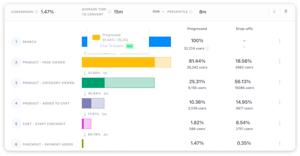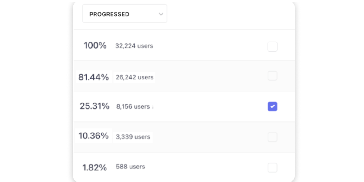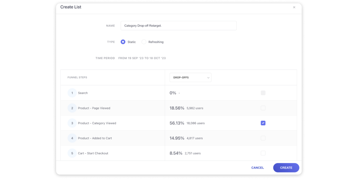 a. Analytics-driven Segmentation: Generate user lists for those who dropped off or progressed directly within the Funnels interface.