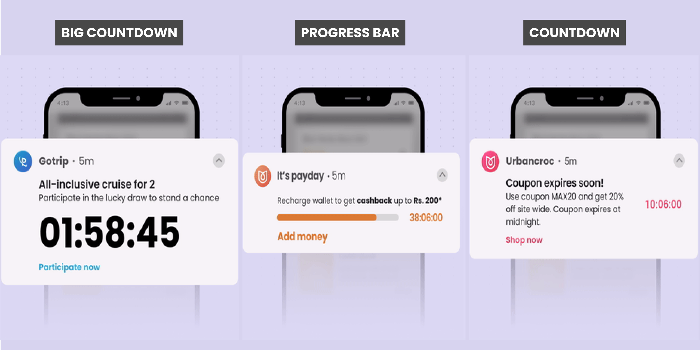 Elevate your Android push notifications with our latest Timer layout, featuring three captivating templates – Countdown, Progress Bar, and Big Countdown. Now, define the timer duration or end time according to your campaign strategy, adding a sense of urgency to your messages!