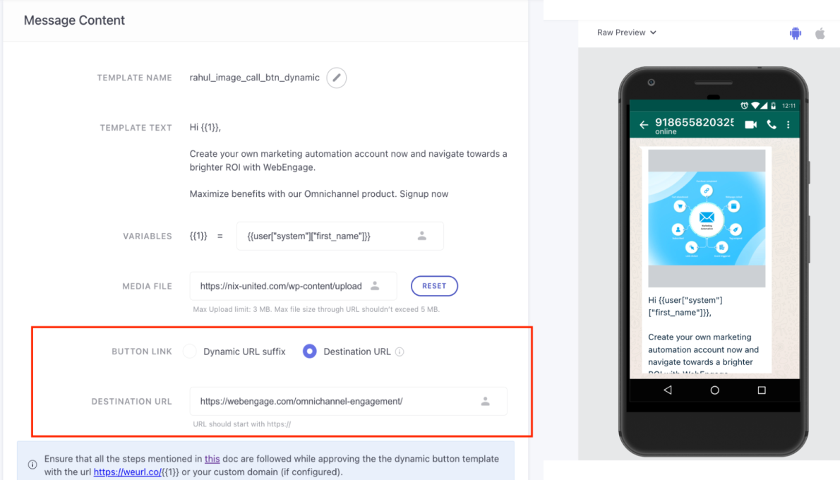 For example, if your custom domain is wsins.com, then add the destination domain as https://wsins.co/{{2}}. - Destination URL: Add the destination URL directly on your WebEngage dashboard while setting up the campaign.