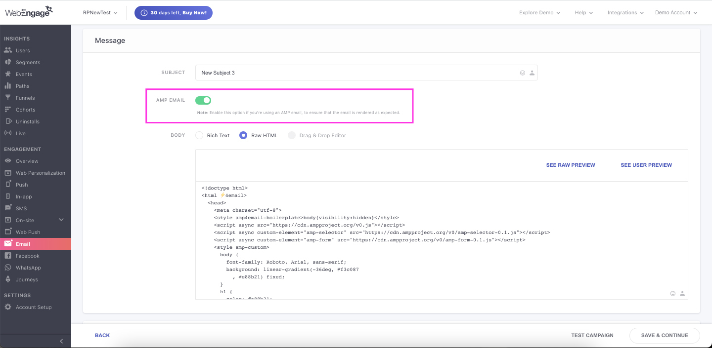 We now support Accelerated Mobile Pages (AMP) emails for the Sparkpost Email Service Provider (ESP). So if you are using Sparkpost as your ESP, you can use this feature to start sending personalized AMP emails to your users. This means that you can now send webpages, surveys, carousel images, and more personalized graphics through emails. The toggle on the dashboard will help you turn on the AMP functionality (if needed) while sending an email campaign.