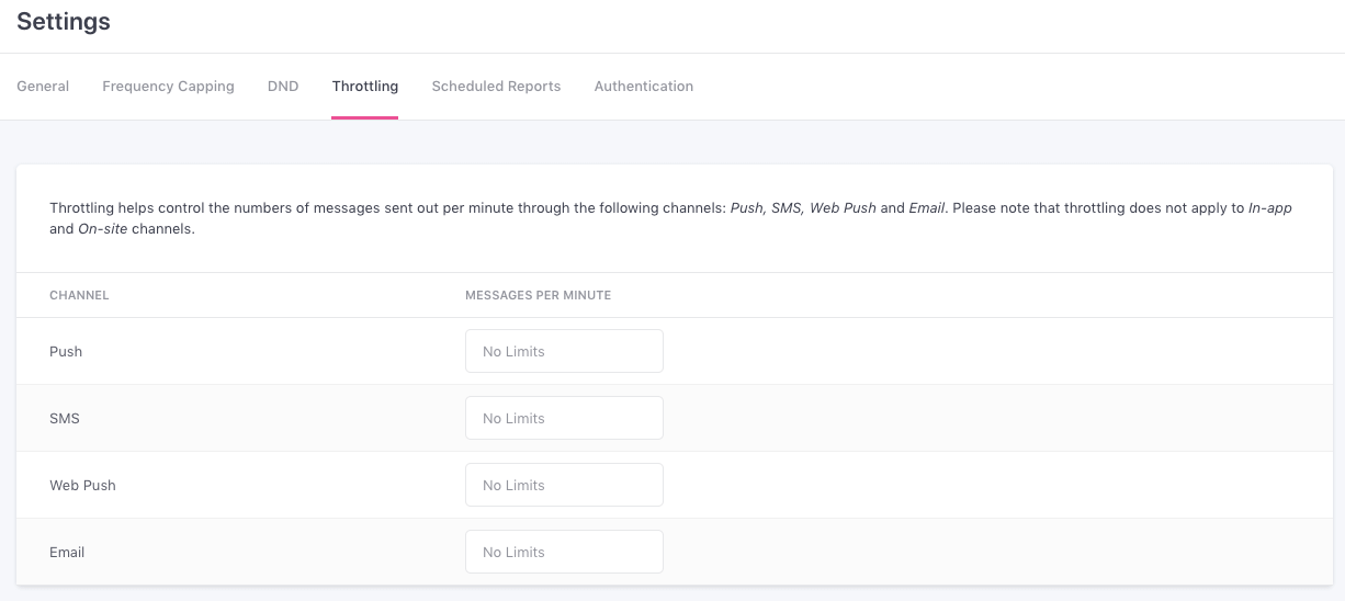 Throttling helps you control the numbers of messages sent out per minute through the following channels: Push, SMS and Email. With this feature, you will now be able to achieve a use case such as Across all my email campaigns, ensure that only 5,000 emails go out per minute. We will then ensure that only 5,000 emails go out per minute regardless of the number of campaigns running. This feature can be helpful when you want to prevent your systems from being overloaded eg. if a one-time campaign goes out to millions of users at the same time, and a number of them end up clicking the notification and visiting the app, it may lead to systems being overloaded with too many users. Another reason for this feature is to take care of the case where your ESPs or SSPs require you to not send more than X messages per minute/per hour. You can access this feature from the Settings section in your dashboard.