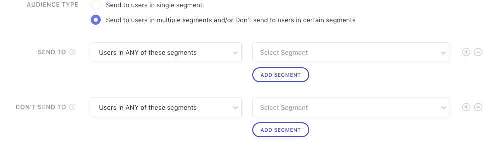 You can now choose to send your campaigns to more than one segment. You can also exclude users in certain segments from receiving the campaign. This functionality of including/excluding segments is available in the Audience tab of the campaign creation process. Each of the segments in Send To (and Don’t Send To) can be joined based on AND condition (think intersection of sets) or OR condition (think union of sets) eg. users can be in Segment A OR Segment B OR Segment C, users have to be in Segment A AND Segment B AND Segment C.