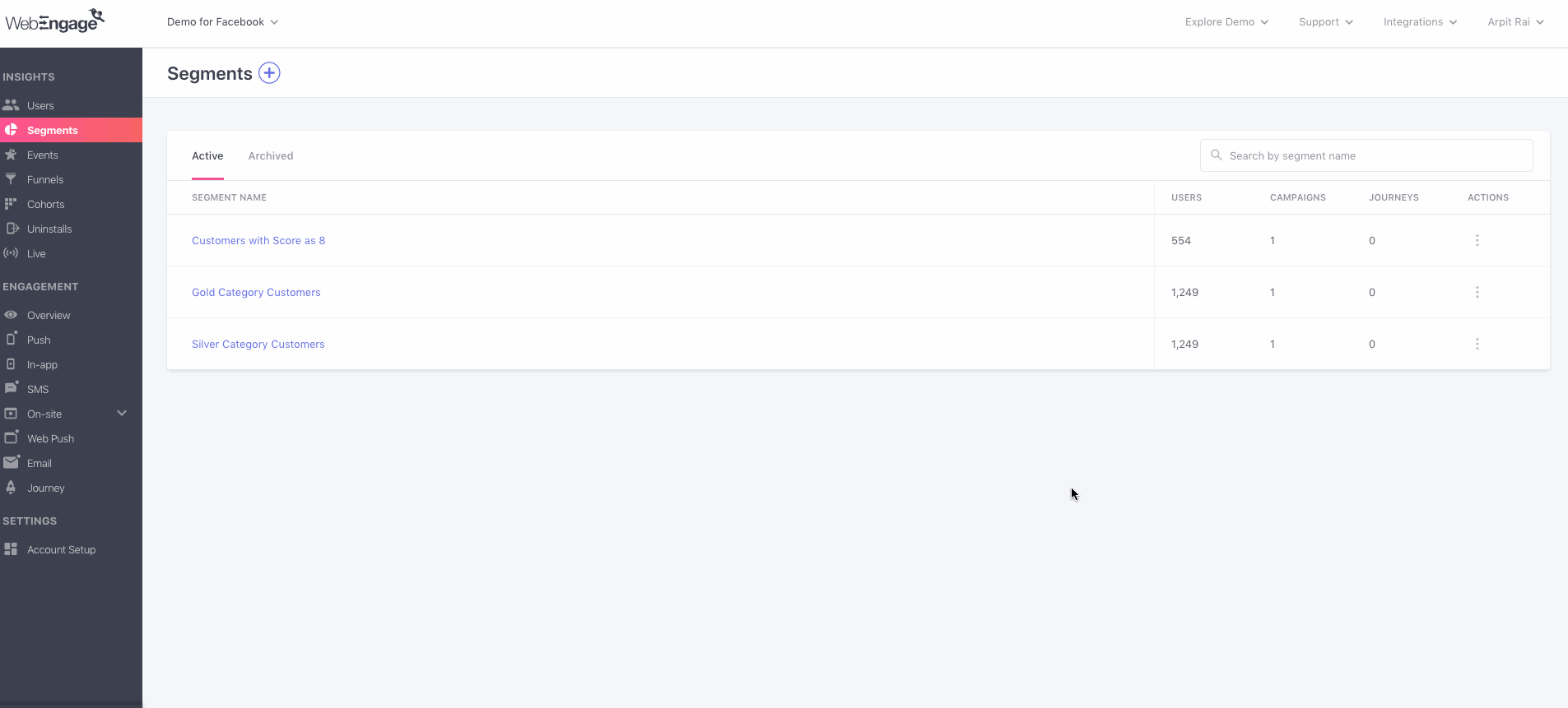 You can now download the list of users in a segment or export the list of users to Facebook directly from the segment list page. Just click on the actions menu on any of the segments in the segment list page to access this. This action is also available as an icon on top on the Segment > Overview, Analyze, List of Users page.