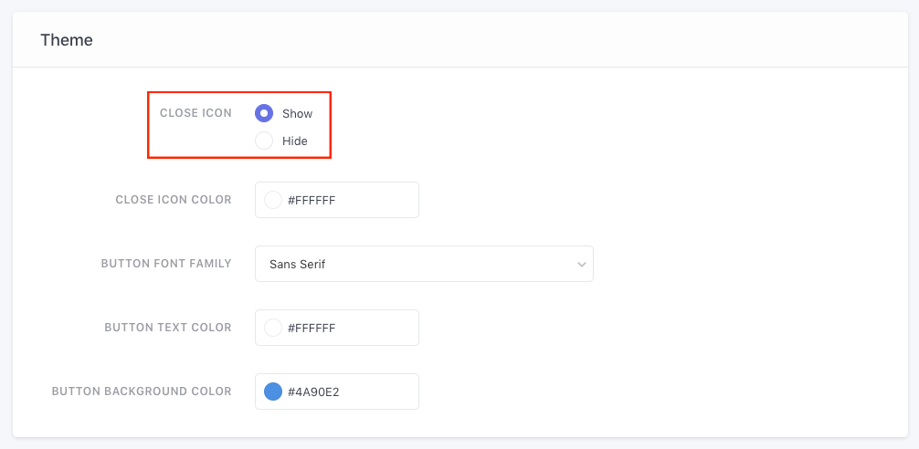 The close icon/button is now optional in all in-app layouts. By default, the setting is on and the close icon/button will be shown. However, you can choose to turn the setting off in the Message tab of the campaign creation process. Some ways in which this is helpful is when you want to force the user to upgrade the app by clicking the in-app message (as they will not be able to access the app by closing the in-app message anymore).