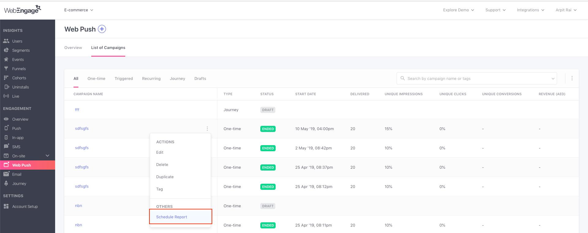 You can now schedule reports for individual campaigns as well. Previously, the scheduled reports were available only for all your campaigns in a channel. With this release, you can now choose to receive regular daily / weekly / monthly updates for specific campaigns. You can schedule these reports by clicking on the actions icon for any campaign in the List of Campaigns page. This action is also available as an icon on top on the Campaign Report > Overview, Analyze, List of Users page.
