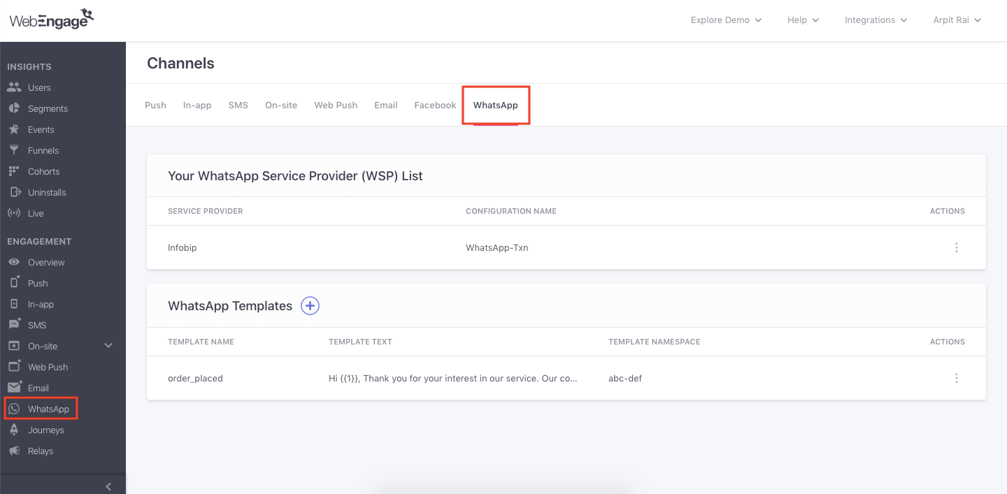 You can now send WhatsApp campaigns through WebEngage. Just like emails and SMS are sent through ESPs and SSPs, WhatsApp messages are sent through WSPs (WhatsApp Service Providers) such as Infobip, Gupshup etc. We’re rolling this out in a phased manner and this will be enabled for all our customers very soon. More details in our documentation.