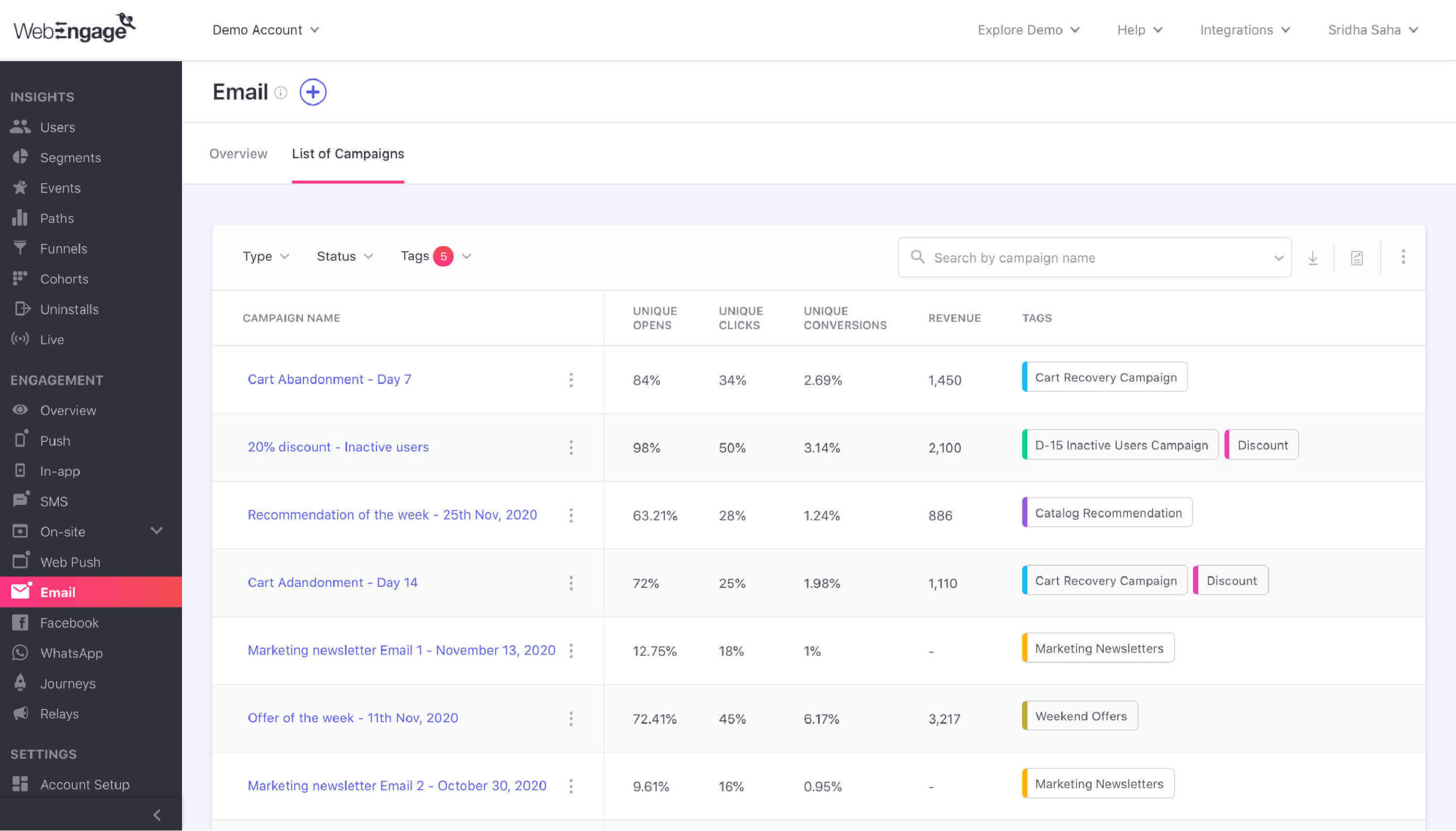 Many of you might have already been using Tags as a feature while running campaigns on WebEngage. Now, these Tags have come up with a UI tweak! We have associated every Tag with a color so that it’s easy for you to register and remember. These color-coded Tags, now, will also be visible on the Campaign & Journey List pages, Engagement Overview, Channel Overview, and Journey Overview pages for you to get a better insight into your campaign data.