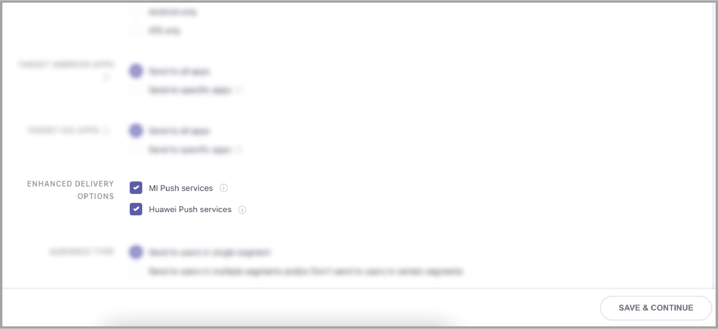 If you have integrated Xiaomi or Huawei push service in your WebEngage project, you will have an option to enable/disable these services while creating a Push campaign. This will help you to analyze the uplift that is being achieved with these enhanced services.