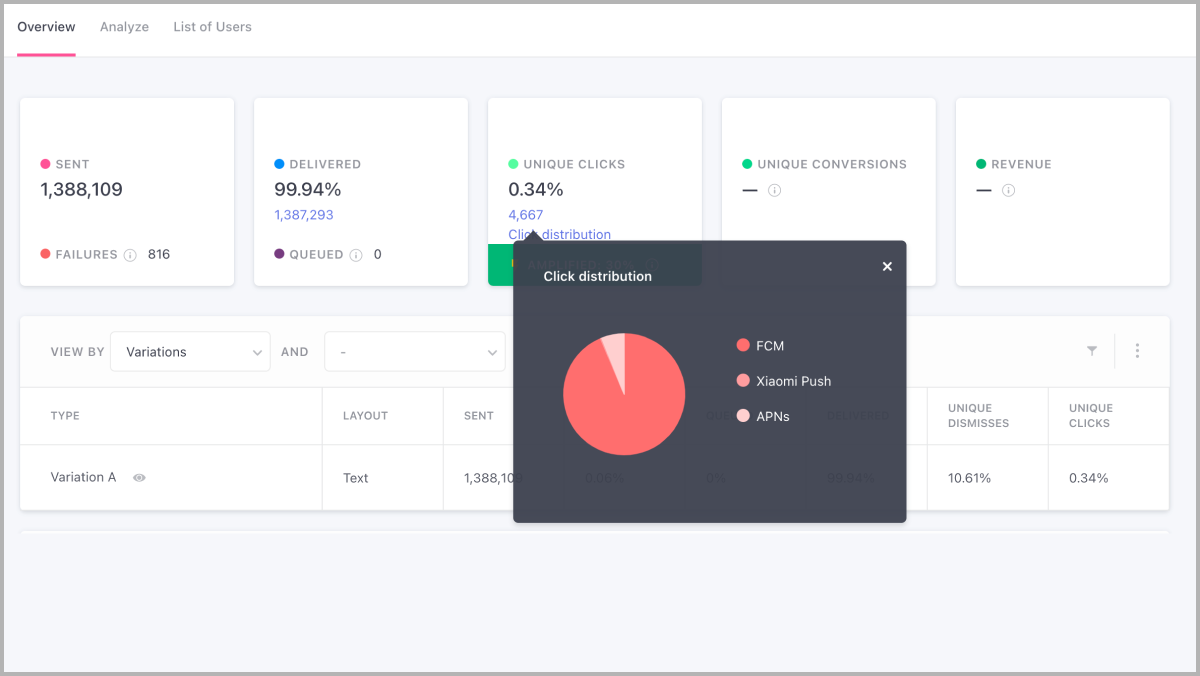 You can now select the “Click Distribution” in the “Unique Clicks” section to see the distribution of clicks via various push sending services – FCM, APNs, Xiaomi, Huawei.