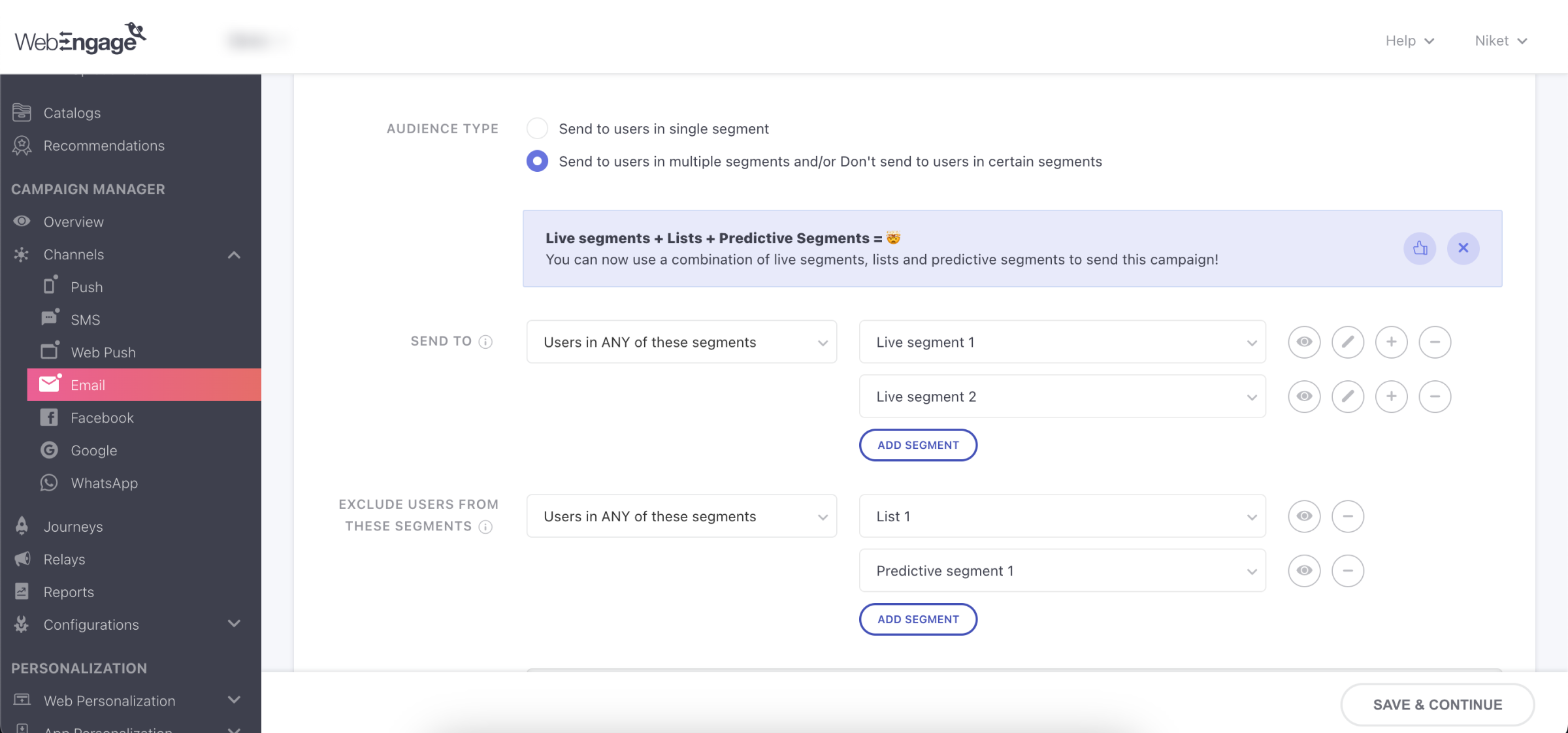 This feature allows you to create advanced segmentation using a combination of live segments, static lists, refreshing lists, and predictive segments while sending your campaigns. Access this feature in the ‘Audience selection’ part of campaign creation. This is applicable for one-time and recurring campaigns of Email, SMS, WhatsApp, Push, and Web Push.