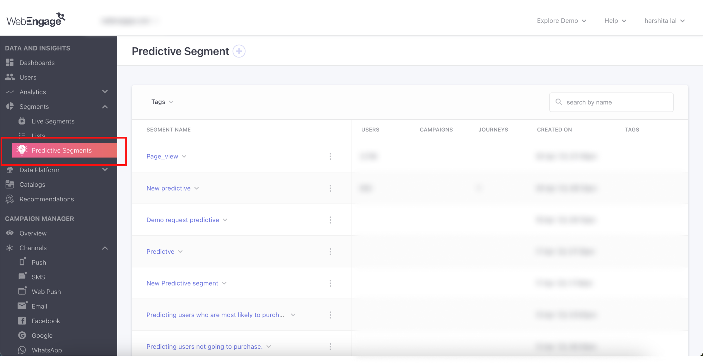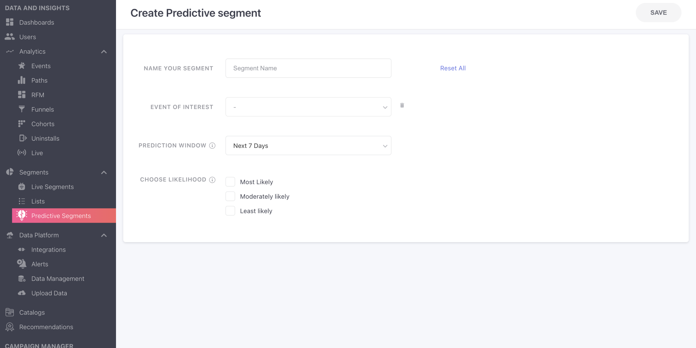 Predictive Segments allow users to create segments based on the future actions of their users. The WebEngage AI uses predictive analysis to categorize users into three segments based on their probability of performing the events: