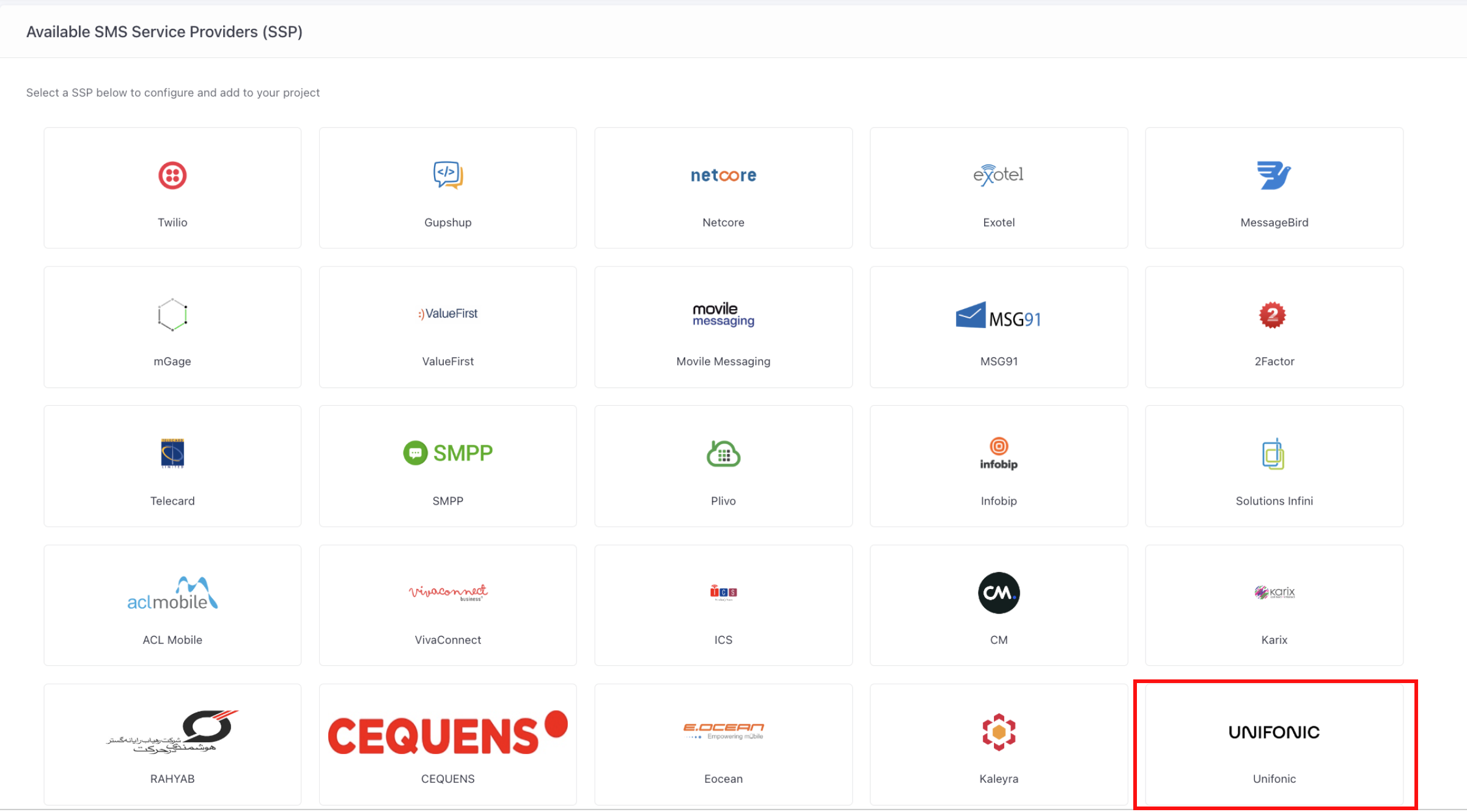 Unifonic is listed under the ‘Available SMS Service Providers (SSP).’ Steps to add it as an SSP are given here.