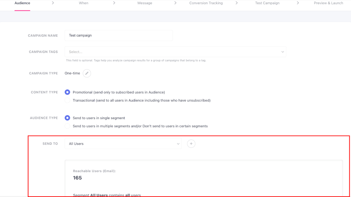 The “All Users” segment will no longer be selected by default when you create a campaign. This change helps ensure that the choice of sending a campaign to all users is an intentional one and it is not sent to all users in a hurry just because it’s the default selection.