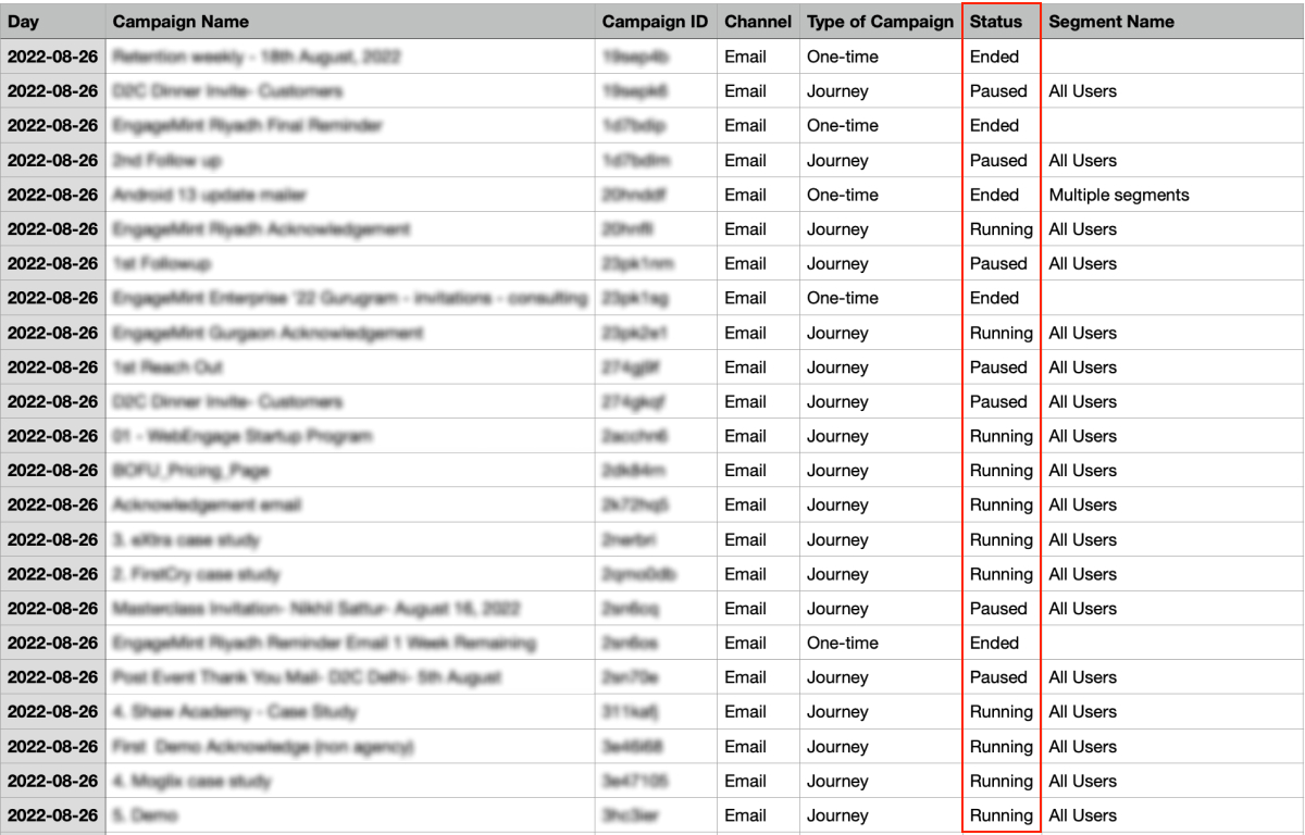 A new column (Status) has been added to the campaign and journey reports. The status is in sync with the status shown on the dashboard (Ended, Paused, Upcoming, Running).