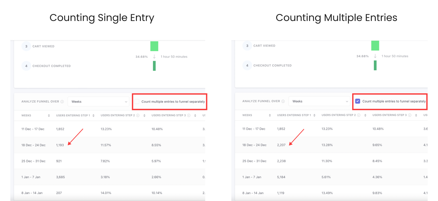 When analyzing the funnel over a particular event attribute, you now have the option to count the user across various values of that attribute. For example, when analyzing a funnel over weeks, if the user performs the entry event every week, they would be counted in each week’s row.