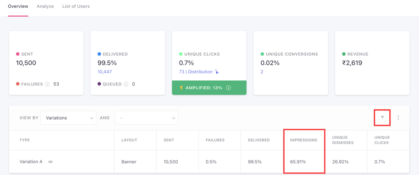 You can now check the Impressions metric for a given campaign on its Overview page by selecting ‘Impressions’ from the filter icon as shown below: