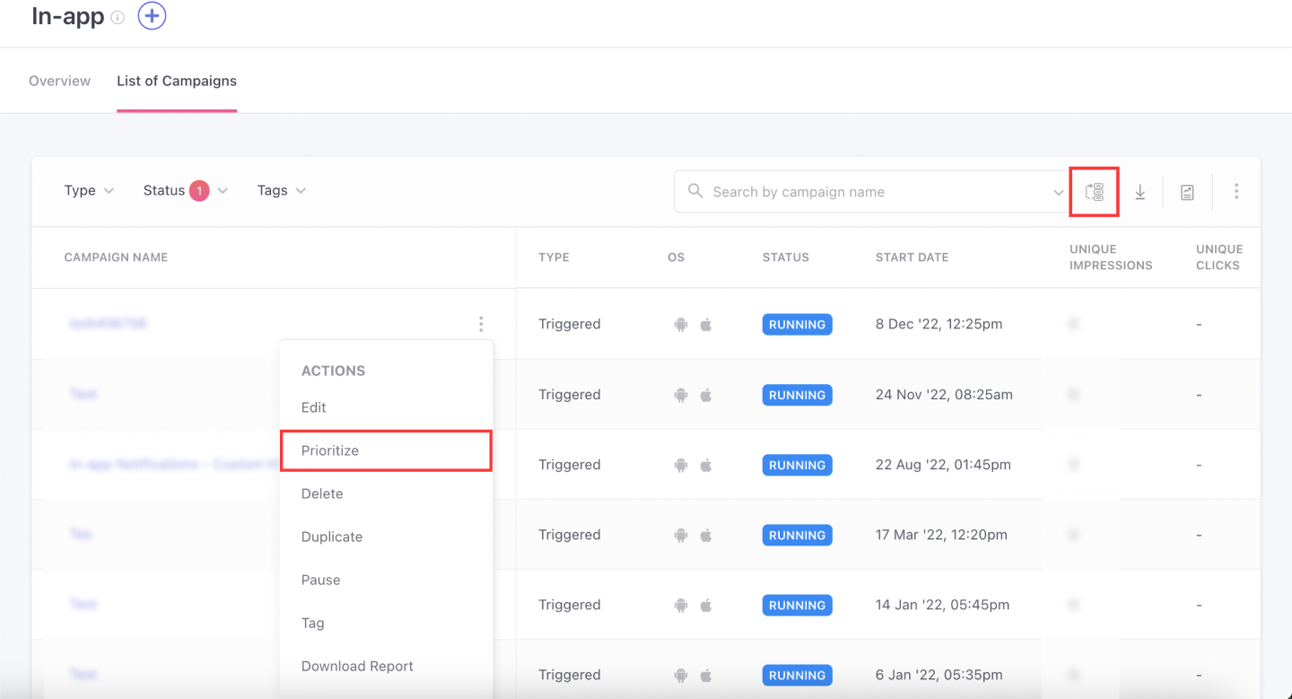 If multiple campaigns are eligible to be shown to a user on a particular screen, in that case, you can now decide your own priority amongst those campaigns by using a drag-and-drop interface as shown below.