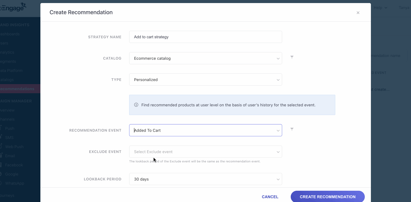 To implement this, look for the option ‘exclude event’ when creating a recommendation strategy. Select the event of your choice from the drop-down which you have already mapped.
