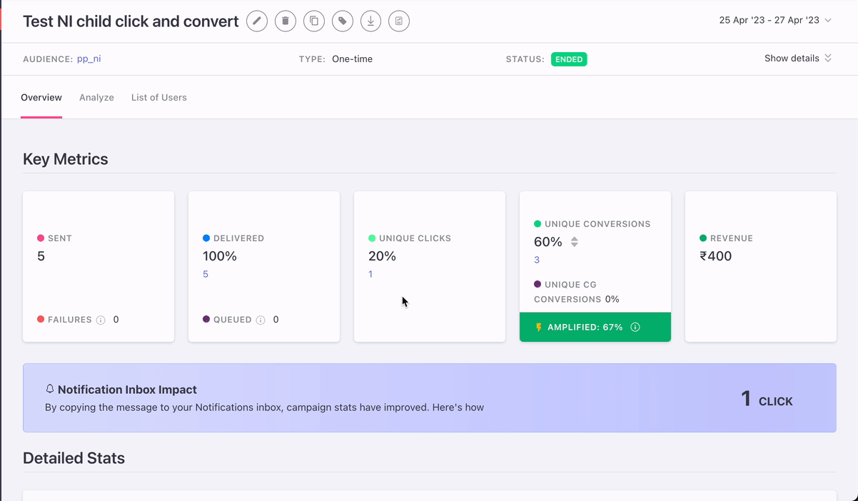 - Showcasing amplified clicks and conversions by the notification inbox within push campaign stats.