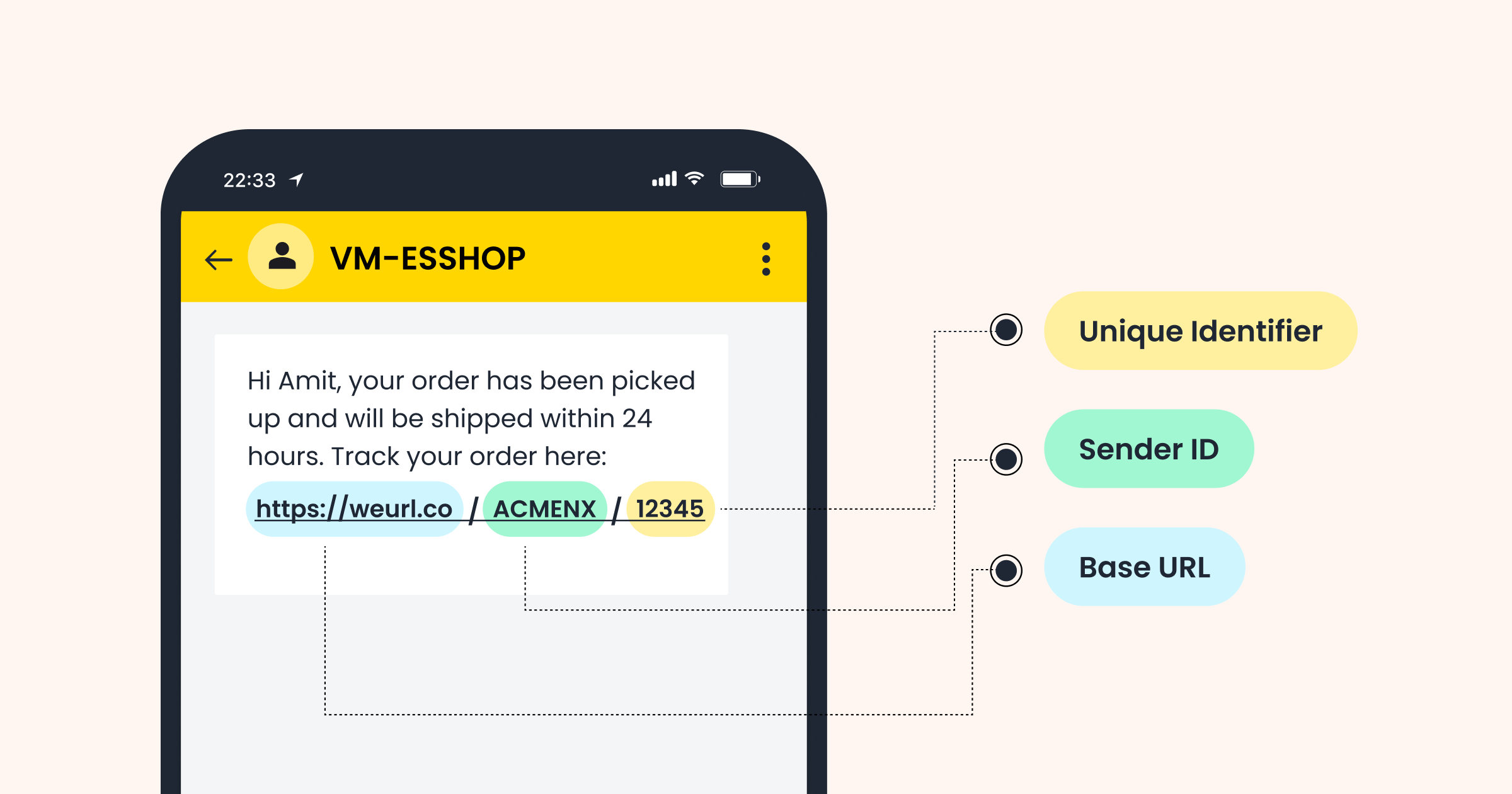 Example: https://weurl.co/ACMENX/, (Here, ‘ACMENX’ is the Sender ID). - Unique Identifier: This value is unique to each end user (SMS receiver) and helps map clicks back to each user.